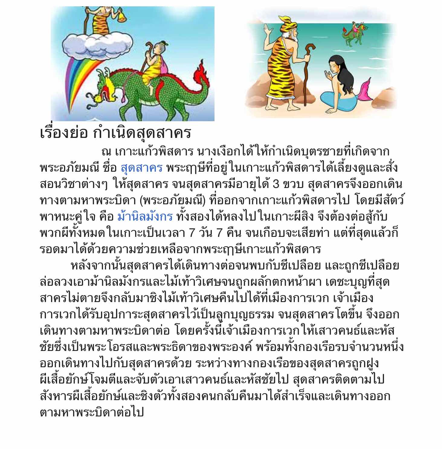 โคบุตรเป็นพระโอรส ของพระอาทิตย์และนางฟ้า เมื่อ นางฟ้าคลอด โคบุตรแล้วก็ปล่อย ให้นางไกรสรราชสีห์แม่ลูกอ่อน เลี้ยงดูให้ชื่อว่าดคบุตร แปลว่าลูกของพระอาทิตย์ โคบุตรกินนม ราชสีห์จึงมีพละกำลังมหาศาล พระอาทิตย์ยังบันดาลให้โคบุตร เป็นผู้มีฤทธิ์ และให้ของวิเศษไว้ป้องกันตัว ต่อมาเมืองพาราณสีเกิด กบฏ ด้วยปุตรหิตคิดแย่งชิงอำนาจพระเจ้าพรหมทัตและฆ่าพระเจ้า พรหมทัตถึงวรรคต โคบุตรได้ช่วยปราบปรามและชุบชีวิตพระเจ้า พรหมทัต ให้คืนชีพ พระองค์จึงเลี้ยงโคบุตรไว้ พระเจ้าพรหมทัตมี ธิดาและโอรส คือนางมณีสาคร และอรุณกุมาร โคบุตรและพระ อรุณไปเที่ยวป่าและได้ฆ่ายักษ์หัสกันมัจฉาตาย แล้วได้นางอำพัน มาลามาเป็นชายา ต่อมาพรเจ้าพรหมทัตอภิเษก โคบุตรกับสอง นาง คือ นางมณีสาครเป็นมเหสีฝ่ายขวาและนางอำพันมาลาเป็น มเหสีฝ่ายซ้าย โคบุตรรักนางมณีสาครมากกว่า นางอำพันมาลาจึง ทำเสน่ห์ ต่อมาอรุณกุมารมาแก้เสน่ห์ให้นางอำพันมาลาสารภาพ ผิด โคบุตรจึงขับนางอำพันมาลาซึ่งทรงครรภ์แก่ให้ไปอยู่ในป่า นางราชสีห์จึงน่าโอรสมาให้โคบุตรเลี้ยงดู ฝ่ายนางมณีสาครนั้นมี โอรสสองพระองค์ คือ มณีสุริยัน และอำพันสุริยาตะวันนาคา เพื่อนของยักษ์หัสกันมัจแค้นที่เพื่อนถูกฆ่าตาย จึงออกอุบายให้ นางมณีกลีบสมุทรธิดาจองตนแกล้งมาเป็นชายาของโคบุตรแล้วหา ทางสะกดโคบุตรมาให้ฆ่าเสียให้หายแค้น นางมณีกลีบสมุทรเห็นดี ด้วย จึงปลอมแปลงมาเป็นชายา แต่นานไปเกิดหลงรัก โคบุตร ไม่อาจหักสวาทฆ่าโคบุตรได้ลง จึงเลิกล้มแผนการร้าย
